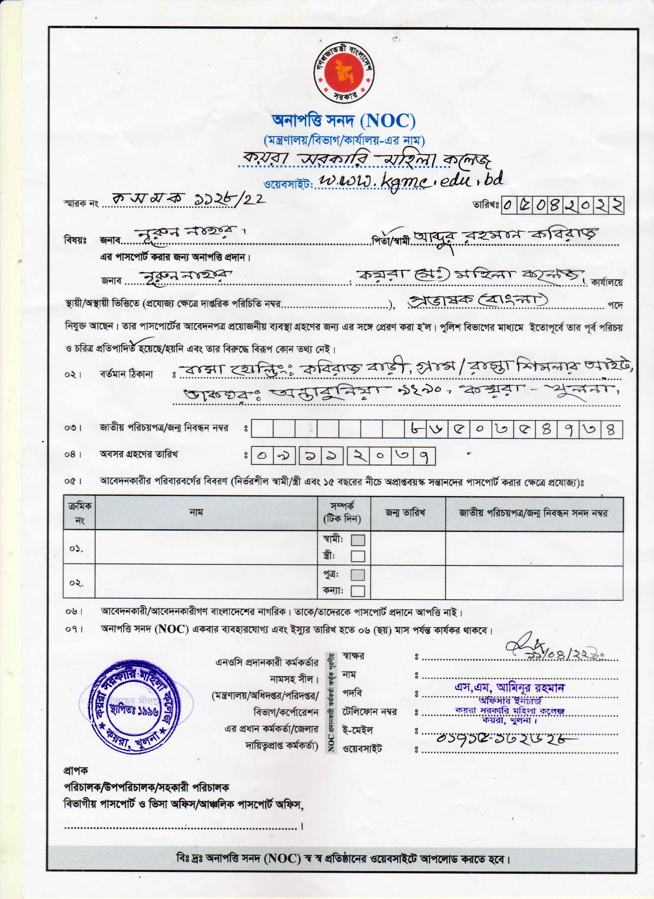 NOC of নূরুন নাহার