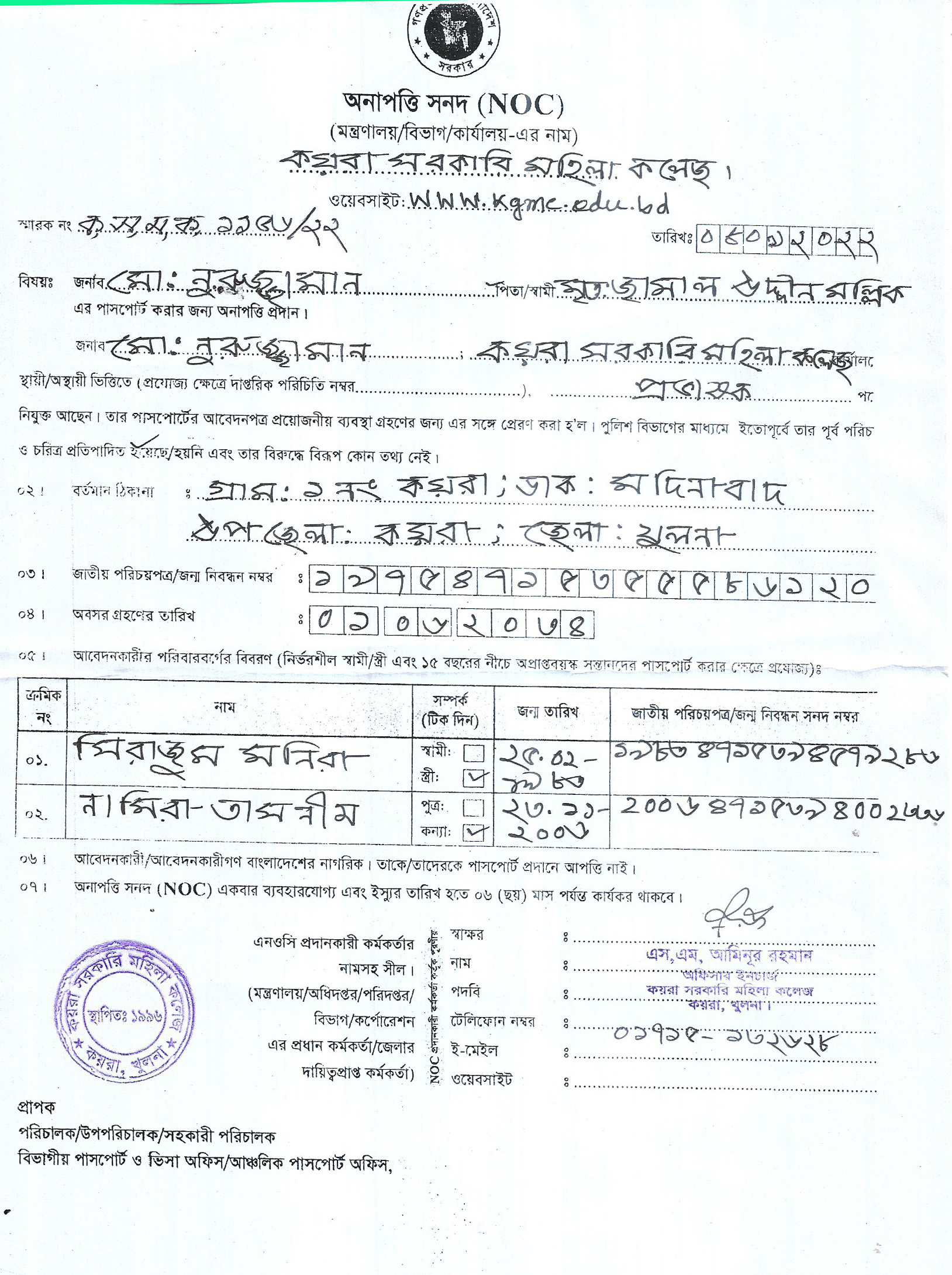 NOC of মোঃ নুরুজ্জামান